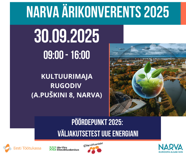 30. septembril 2025 toimub Narva Ärikonverents, mis toob kokku Narva ja kogu Ida-Viru maakonna ärijuhid, ettevõtjad, alustavad ettevõtjad, avaliku sektori ja haridusvaldkonna esindajad, poliitikud ning majanduseksperdid. Konverents pakub suurepärast võimalust osaleda aruteludes olulistel teemadel: tööjõu tulevik, koostöö hariduse ja ettevõtluse vahel, rohepööre ja energiatõhusus, uued ettevõtlusvormid ja innovatsioon. Kohal on tunnustatud eksperdid ja spetsialistid, kes jagavad praktilisi teadmisi ja nõuandeid. Ärme räägi Narva tulevikust – loome selle koos!   Toimumiskoht: Narva Kultuurimaja Rugodiv (A.Puškini 8, Narva). Konverentsil on tagatud eesti-vene ja vene-eesti sünkroontõlge. OSALEMINE ON TASUTA! PÄEVAKAVA JA REGISTEERIMINE